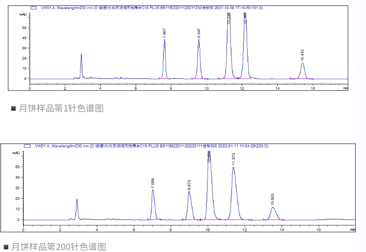 针对部分样品量大,希望加快检测速度的客户,美正检测开发了短柱快速检测方法,每个样品仅需要10 min,分离效果可以满足国标要求。比国标推荐方法的分析时间节约了检测时间,提升了检测效率。