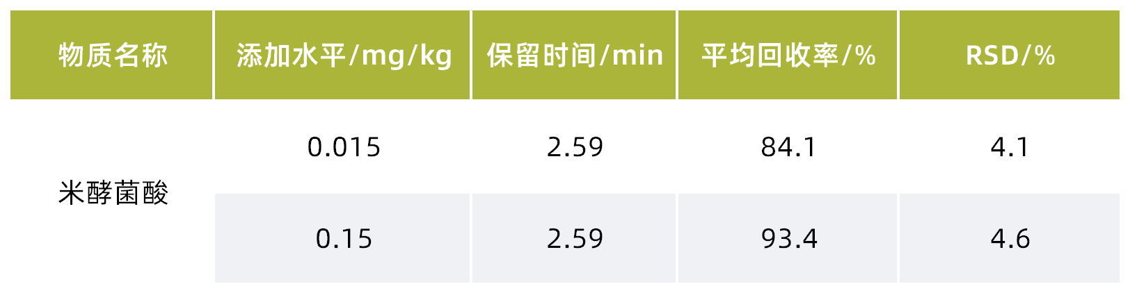 美正生物重现国标GB 5009.189-2016,使用MAX小柱对凉皮样品进行了净化,结果表明,使用MAX固相萃取小柱净化后,米酵菌酸回收率均满足检测要求且RSD小于10%。说明MAX小柱适用于凉皮中米酵菌酸的检测,且方法稳定。
