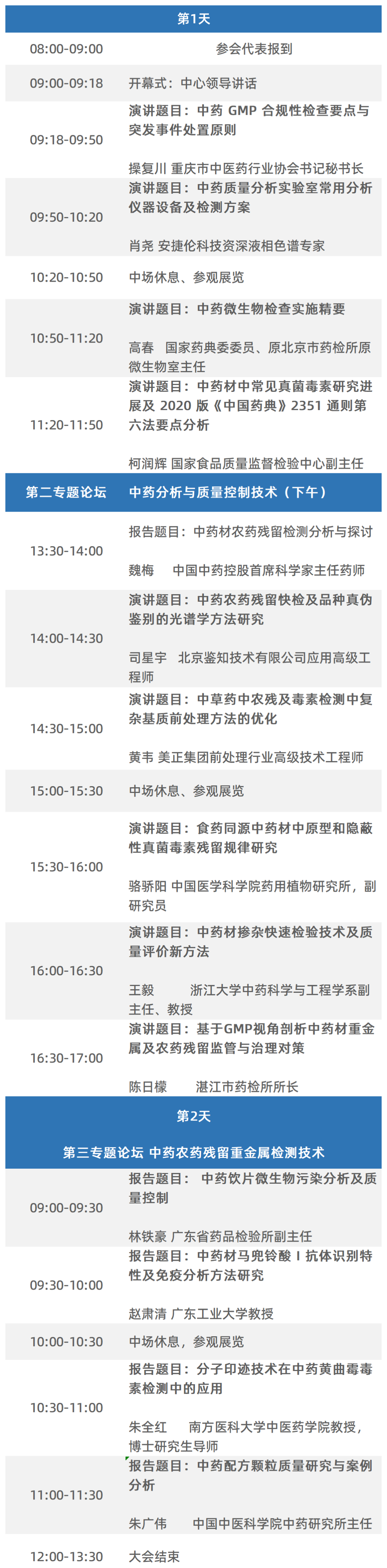 本次大会上,还将邀请国家食药总局、中国食品药品检定研究院、广东省药监所、广州市疾病控制中心、官方机构代表出席会议并做报告,会议除了主题发言外,还针对中药农残重金属的热门话题展开探讨。会议内容包括《中药分析与质量控制技术》《中药农药残留重金属及黄曲霉菌检测技术》。