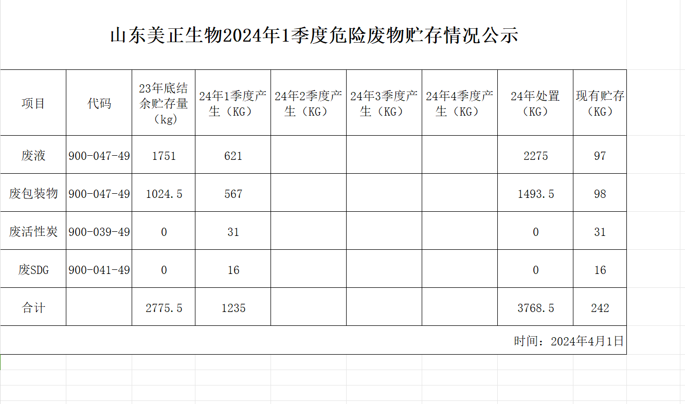 山东美正生物2024年1季度危险废物贮存情况公示如下: