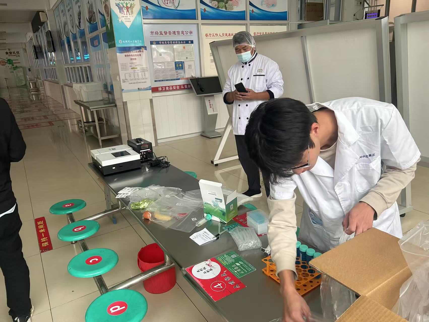 美正配合山东省高新区市场局,于学校食堂,运用阴离子洗涤剂,农兽残快检产品进行现场抽检。